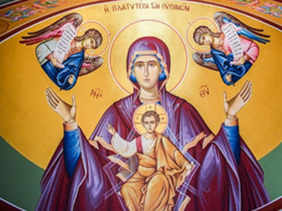 Eastern Orthodox church icons of Mary, Jesus, and angels that are sacred images used in worship.