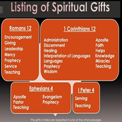 The first list of spiritual gifts appears in 1 Corinthians 12:7-11: administration, wisdom, knowledge, faith, healing, miracles, prophecy, discerning of spirits, speaking in tongues, and interpretation of tongues.